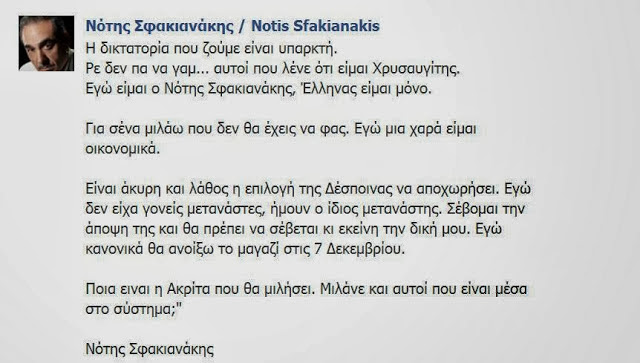 Απάντηση στις επικρίσεις που δέχτηκε για τις δηλώσεις του σχετικά με τη Χρυσή Αυγή, έδωσε ο Νότης Σφακιανάκης.